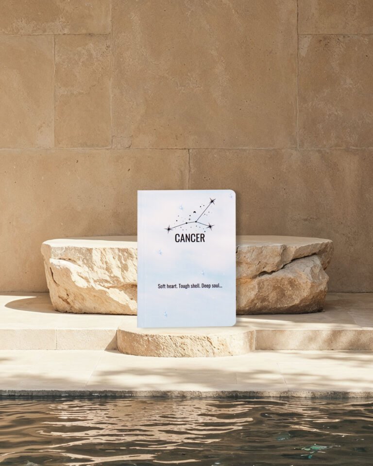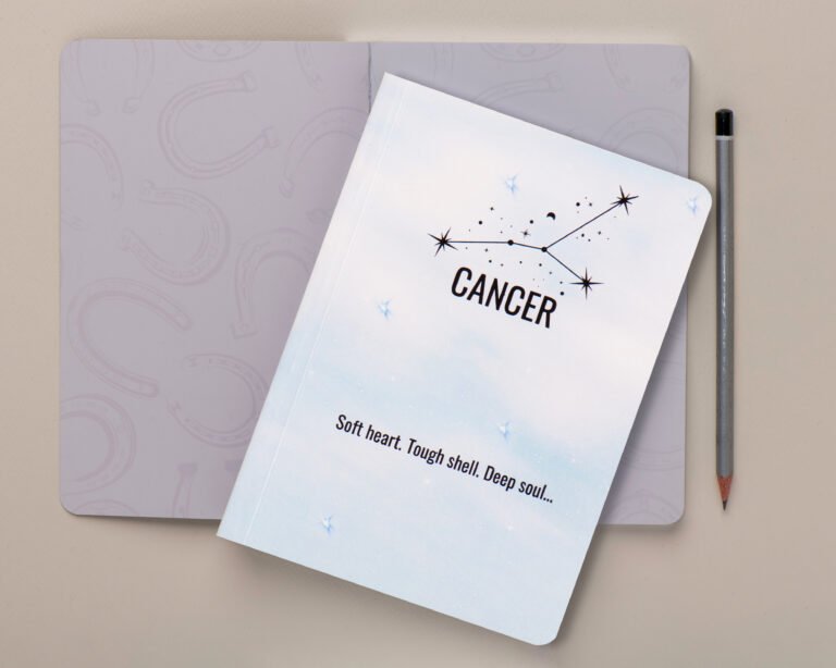Celebrate your nurturing spirit with the Cancer journal. This notebook features a luminous, light-blue ethereal design, perfectly suiting the water sign known for its emotional depth and resilience. The cover phrase, “Soft heart. Tough shell. Deep soul.” pays homage to the protective and compassionate nature of the Cancer.